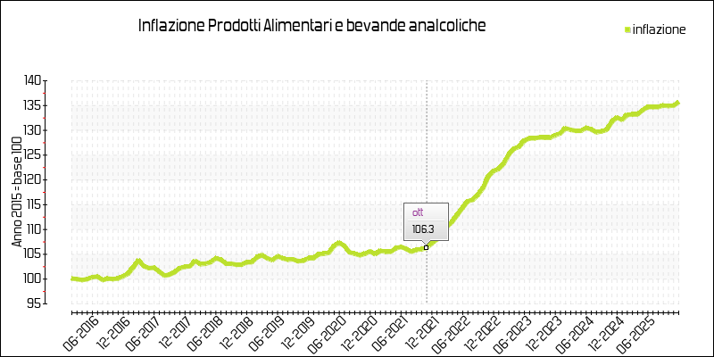 Si nota che nel 2016 per il Carrello della spesa si spendeva circa 100 (euro), a ottobre 2021, dove è posizionata l'etichetta nel grafico, si spendevano solo 106.30 euro, il valore nei periodi successivi si è impennato fino ad arrivare a 135.7 euro nel nov 2025.